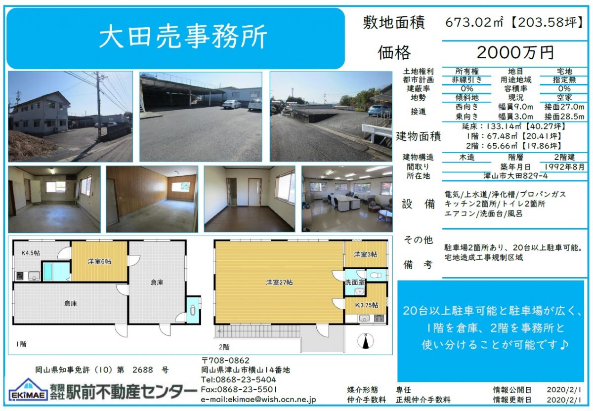 2020年2月5日(水) ★NEW★新規物件情報のお知らせ 【事業用事務所】津山市大田 ※売買、賃貸どちらでも対応可 売買価格 2000万円 賃料20万円(税抜) 東一宮グリーンヒルズからすぐ近くの、大きな道路に面した事業用物件です。 駐車場が2つあり、来客用と従業員用で分けることができ、最大で20台程度駐車可能です。 一階を倉庫、二階を事務所にするというような使い分けも可能です。 広域農道へも市街へも出やすい立地です。 ご興味おありの方はお気軽にご連絡下さい。詳細のご説明をさせて頂きます。 よろしくお願い致します。(vv)